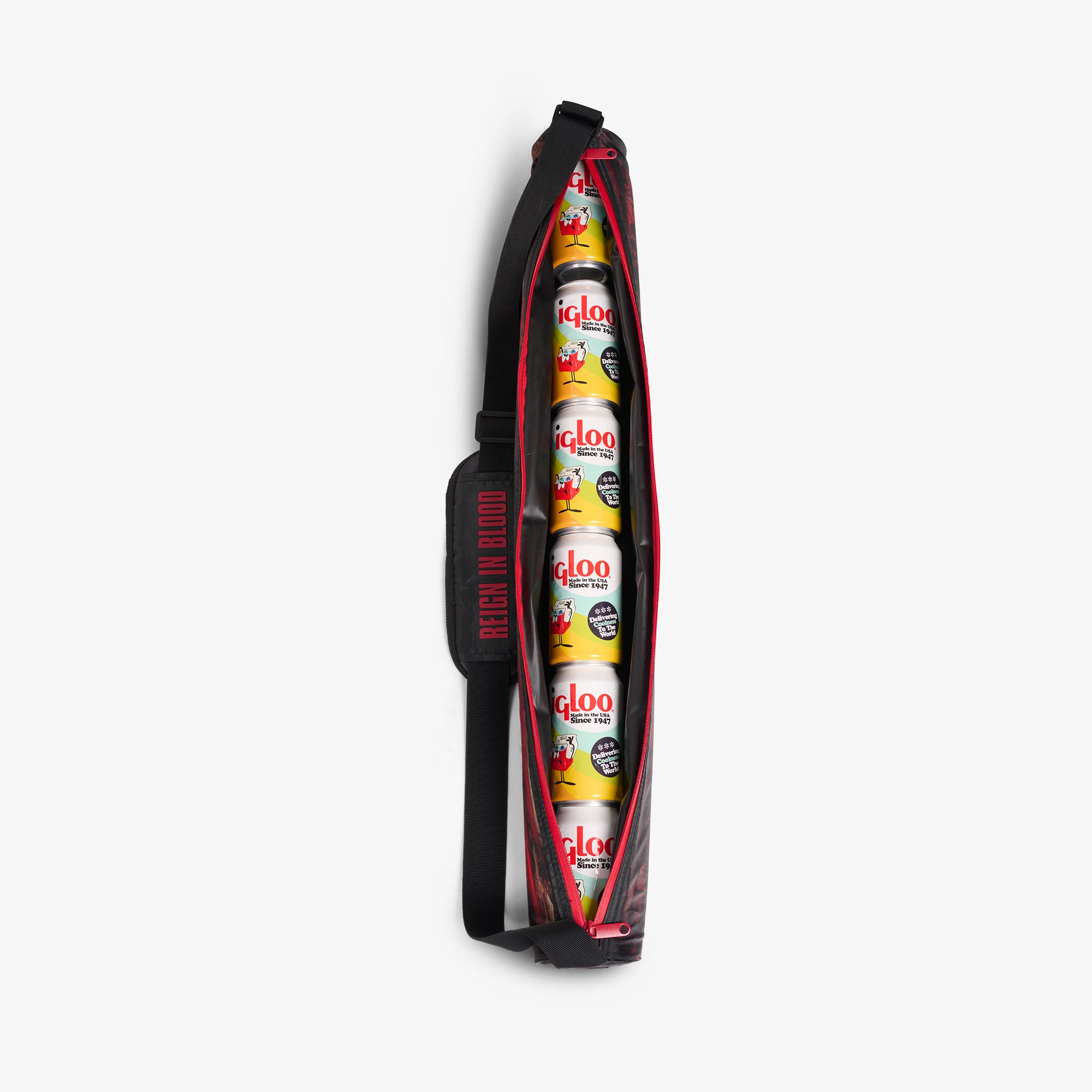 We poured blood. sweat and beers into the creation of our most extreme coolers ever. Influenced by Slayer ?? the masters of thrash metal ?? this wearable 6-can single-barrel sling cooler bag channels Reign in Blood. the band’s boundary-pushing third album and arguably the greatest speed metal album of all time. (And by divine invention. this can matches the Reign in Blood KoolTunes. Playmate Classic and 16 Oz Can.)